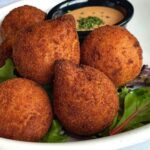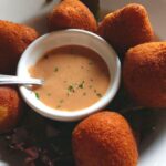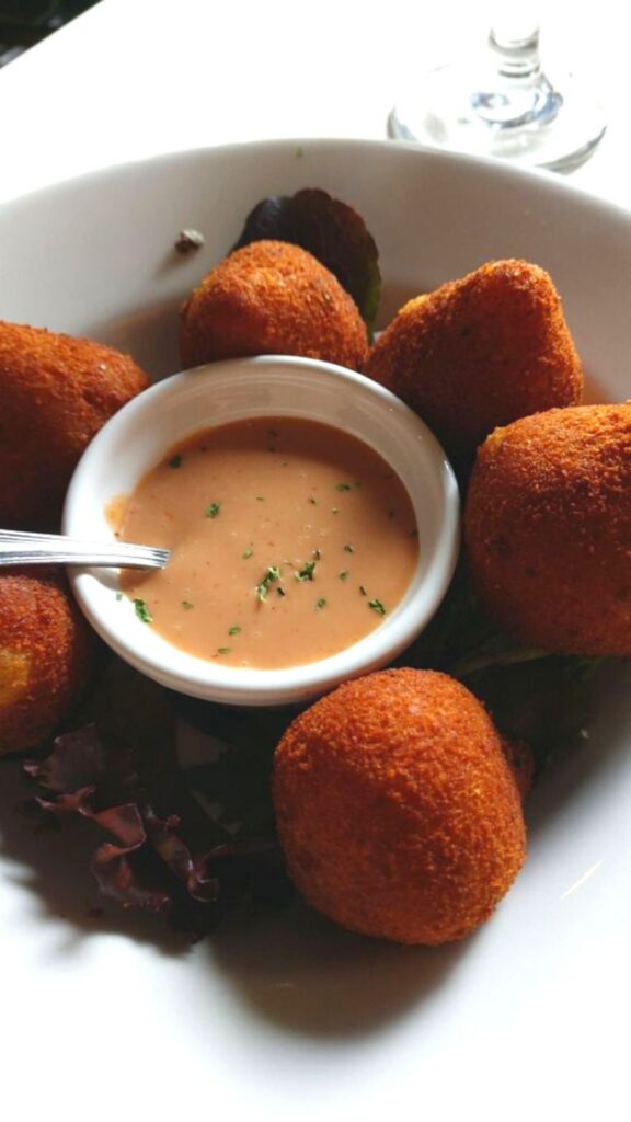 Bolinhos fritos de bacalhau, batata e salsinha. Servidos com molho tártaro.