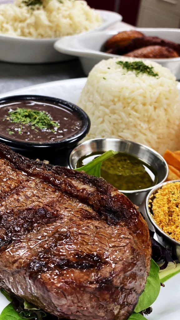 Picanha Steak skewers with farofa and chimichurri sauce. Limited availability.
